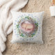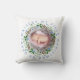 First Christmas as grandma of a boy wreath photo throw pillow. This festive design showcases a photo of the baby in a Christmas wreath frame and the text : "MY FIRST CHRISTMAS AS GRANDMA. 20XX" in blue.