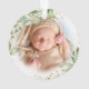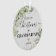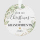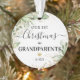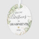Surprise your parents with this sentimental christmas tree ornament featuring a simple white background, elegant watercolor green eucalyptus foliage, faux gold foil accents, the saying "our first christmas as grandparents, and the year. On the reverse is a treasured photo of their grandchild.