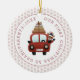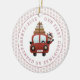 Our first Christmas as grandparents car with gifts rose gold snowflakes photo Ceramic Ornament. The front features a car with a deer and gifts and the text "Our First Christmas as grandparents" and a border of rose gold glitter snowflakes and the back the photo of the baby girl with the same border. Change photo and add your details!