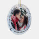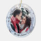Christmas ornament featuring your own custom photo framed by an image of snow covered pine trees with your custom texts.