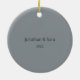 This photo Christmas tree ornament features photo frame to fill the front of the ornament. A graphic of a silver grey ribbon banner, near the bottom, features the text: First Christmas as Mr. & Mrs. Custom text, on the back, allows you to add the names of the bride and groom and the year. This ornament is a perfect Christmas gift for the newlyweds.