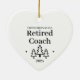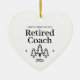 First Christmas as a retired coach heart ornament for a retirement. Elegant porcelain ceramic holiday ornaments in white with black lettering. Featuring Christmas trees and stars.