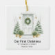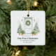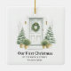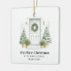 A serene white round ceramic ornament featuring a soft watercolor front door with wreath, potted evergreens, and warm lanterns. The arched headline reads “FIRST CHRISTMAS AT,” with lines below for your street, names, and year. The gentle sage-green palette suits any tree and makes a thoughtful first-home keepsake or housewarming gift. Update the address, add names, and set the year for a timeless piece you’ll hang every December.