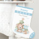 Cute Christmas Blue and Green Christmas Stocking For baby boy's First Christmas with custom text. Cute Christmas baby bear, Christmas tree, gifts and gingerbread cookies. You can personalise it with any text so you can use it for a little boy, not just for the first Christmas. - Kate Eden Art