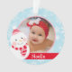 Baby's 1st Christmas holiday ornament features a custom photo, name and birth year of baby girl with a jolly winter snowman and cute penguin. Red, ice blue, pink and white design features a winter snowflake patterned background.