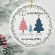Celebrate baby’s first Christmas with this charming ceramic photo Christmas ornament, perfect for new parents! One side features three festive trees in pink and blue, symbolising mummy, daddy, and baby, with the elegant script "Our First Christmas as a Family of Three." The back offers a customisable circular frame for your favourite photo of your little one and space for the year. This personalised Christmas gift is a beautiful keepsake to cherish for years to come.
