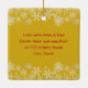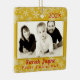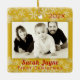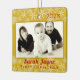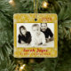 Baby photo first Christmas ornament keepsake. Double sided, square tree ornament in golden yellow with red text. Photo template is horizontal with a gold border. Year date at the top, with name and “first Christmas” text beneath the photo. On the back more text an be added. An example could be the home address where the child first lived, or say “Merry Christmas” to make it a gift ornament to the grandparents or relatives.