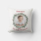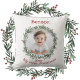 First Christmas Baby's Photo Keepsake Throw Pillow designed with your baby's picture with a Green and Red Holly Wreath surrounding the image. The text includes: Your Child's First Name, The Year, and My First Christmas, in a bright matching red. To personalise, simply insert your photo into our easy template, replacing the sample image. Click: FILL, and be sure to centre the image as you like. The wreath will remain on top of the image. Next, insert the first name and year into our template, replacing the sample text. The text: My First Christmas will remain. The reverse side is a matching bright red. Be sure to check the preview before finalising. It's fast and easy!