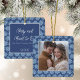 Commemorate your first Christmas as an engaged couple with this beautiful photo ornament with a classic blue and white hand drawn poinsettia pattern featuring a photo on one side and your text on the back.