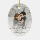Commemorate your engagement with this beautiful modern keepsake ornament. The charcoal gray text reads "Our first Christmas engaged," with the word "engaged" in elegant handwriting script with flourishes before and after. Replace the sample image with your favorite photo, and add your names and the year. A white gradient filter helps make the text pop.