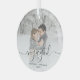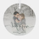 Commemorate your engagement with this beautiful modern keepsake ornament. The dark green text reads "Our first Christmas engaged," with the word "engaged" in elegant handwriting script with flourishes before and after. Replace the sample image with your favourite photo, and add your names and the year. A white gradient filter helps make the text pop.