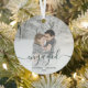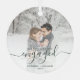 Commemorate your engagement with this beautiful modern keepsake ornament. The dark green text reads "Our first Christmas engaged," with the word "engaged" in elegant handwriting script with flourishes before and after. Replace the sample image with your favourite photo, and add your names and the year. A white gradient filter helps make the text pop.