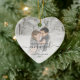 Commemorate your engagement with this beautiful heart-shaped keepsake ornament. The grey text reads "Our first Christmas engaged," with the word "engaged" in elegant handwriting script with flourishes before and after. Replace the sample image with your favourite photo, and add your names and the year. A white gradient filter helps make the text pop.