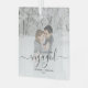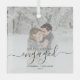 Commemorate your engagement with this beautiful modern keepsake ornament. The charcoal grey text reads "Our first Christmas engaged," with the word "engaged" in elegant handwriting script with flourishes before and after. Replace the sample image with your favourite photo, and add your names and the year. A white gradient filter helps make the text pop.