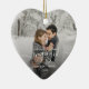 Commemorate your engagement with this beautiful heart-shaped keepsake ornament. The white text reads "Our first Christmas engaged," with the word "engaged" in elegant handwriting script with flourishes before and after. Replace the sample image with your favourite photo, and add your names and the year. A black gradient filter helps make the text pop.