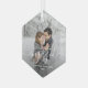 Commemorate your engagement with this beautiful modern keepsake ornament. The white text reads "Our first Christmas engaged," with the word "engaged" in elegant handwriting script with flourishes before and after. Replace the sample image with your favourite photo, and add your names and the year. A dark gradient filter helps make the text pop.