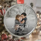 Commemorate your engagement with this beautiful modern keepsake ornament. The white text reads "Our first Christmas engaged," with the word "engaged" in elegant handwriting script with flourishes before and after. Replace the sample image with your favourite photo, and add your names and the year. A black gradient filter helps make the text pop.