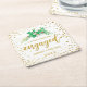 This elegant paper coaster is perfect for holiday engagement parties. The design features a sprig of watercolor holly with green leaves and red berries. Below is faux gold typography that reads "Our first Christmas engaged" with your names and year to personalize. Confetti in faux gold decorates the border. Designed by artist ©Susan Coffey.