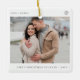 Simple minimalist typography First Christmas engaged custom couple's photo, names, and year tree ornament.