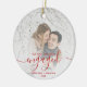 Commemorate your engagement with this beautiful modern keepsake ornament. The red text reads "Our first Christmas engaged," with the word "engaged" in elegant handwriting script with flourishes before and after. Replace the sample image with your favorite photo, and add your names and the year. A white gradient filter helps make the text pop.