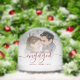 Commemorate your engagement with this beautiful modern keepsake snow globe. The festive red text reads "Our first Christmas engaged," with the word "engaged" in elegant handwriting script with flourishes before and after. Replace the sample image with your favourite photo, and add your names and the year in red sans serif font. A white gradient filter helps make the text pop.