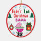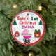 Baby's first Christmas in festive red and green typography. Child's Name in pink. Insert Year in white against pink carriage. Two-sided items has snowman image, or Upload Your Own Image. Baby wearing pink blue bow and waving hand. Whimsical snowflakes in gray and blue, trees, ornament and red gift box, and hand designed pink green baby doll carriage and baby and star elements. Original Photography and Design by TamiraZDesigns.