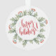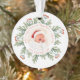 First Christmas as grandma and grandpa is a special time to be celebrated and this lovely keepsake, with their new baby grandchild's photo will be treasured and a wonderful memory to hang on their tree in Christmasses to come! On each side is a Christmassy border of festive green foliage and red berries. On the front, simply replace the sample photo in the middle with that of your own baby. Choose a picture where your baby's face is centred so it will fit correctly into the circular shape. You can easily personalise the text with your son or daughter's name and the year curved beneath the photo, and First Christmas as Grandma and Grandpa is curved at the top, but this can be easily changed to granny and grandad, nanny and gramps, or whatever you wish. On the other side, Happy Holidays is in a set elegant script red typography with the same leafy border.