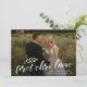 A simple photo holiday card with handwritten first christmas and branch and minimal type. Click the edit button to customise this design.