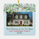 This beautiful holiday keepsake ornament features a photo of your new home with custom "First Christmas in Our New Home" script text, your family name, and the year the home was purchased. Design features modern watercolor winter greenery branches with green leaves and red berries. The light blue background color can be modified. Same design appears on both sides of the custom ornament.