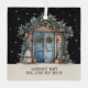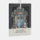 First Christmas in our new home personalised ornament with a beautiful cottage style house door in blue, surrounded by Christmas holly wreath featured on a starry dark night sky - easy to personalise this custom create it yourself holiday decor from Ricaso
