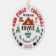 First Christmas In Our New Home round white ceramic Christmas Tree Ornament. The ornament has the option to be customized to your prefered Name and Year, and also the Town/City and State where your new home is. You even have the option to add your photo on the back of the ornament (or leave it as is with the generic winter landscape image, its up to you). Perfect gift idea for the Christmas holidays for every new home owner around the World.