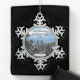 This custom pewter, snowflake shaped, ornament features a beautiful rustic setting on a mountain top. The rustic cabins have snowy roofs as well as the lovely spruce fir trees. The text reads 'First Christmas in our new home', and can be easily customised. The Name and Year is easy to personalise by just typing over them. The rustic photo can also be modified to use a photo of your own home, by clicking on 'customise it'.