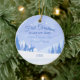 This beautiful custom new home Christmas ornament is personalised with your address and year in elegant blue cursive typography over a scenic landscape drawing of a winter town covered in snow and surrounded by pretty fir trees. Cute holiday present and housewarming gift. First Christmas in Our New Home.