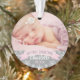 "My First Christmas" banner and snowflake border photo ornament design can be personalised with the baby girl's name and birth year. Includes a second photo on the back. Light pink, grey and white colours.