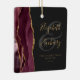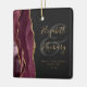 This elegant modern ornament features a burgundy red watercolor agate design trimmed with faux gold glitter. Easily customise the gold-coloured text on an off-black background, with the names of the bride and groom in whimsical handwriting calligraphy over a large grey ampersand. The words "First Christmas Married" appear in serif font along with the customisable year.