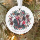 Winter rustic modern wedding Merrily Married photo tree acrylic ornament with red burgundy trendy watercolor peony roses and blooms wreath with seasonal pine hunter green fir branches and holly berries over a clear white background.++++++++ Personalise it with your photo, text and family name on both sides! +++++++++++++ An elegant way to keep the memories following a winter Christmas wedding or as a newlyweds couple.