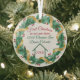 This beautiful custom new home Christmas ornament is personalised with your address and year in chic green and red typography within a festive holly berry wreath with gold garland wrapping around the greenery. Contemporary holiday present and housewarming gift. First Christmas in Our New Home.