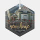 Commemorate your first Christmas in your new home with this beautiful modern keepsake ornament. The text reads "First Christmas in our new home," with the words "new home" in elegant gold faux foil script. Replace the sample image with a photo of your new house and add your family's last name in white sans serif font. A dark gradient filter helps make the text pop.