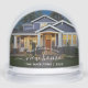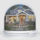 Commemorate your first Christmas in your new home with this beautiful modern keepsake snow globe. The white text reads "First Christmas in our new home," with the words "new home" in elegant handwriting script with flourishes before and after. Replace the sample image with a photo of your new house and add your family's last name in white sans serif font. A dark gradient filter helps make the text pop.