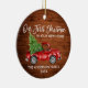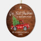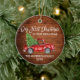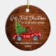 Modern Brush Script Our First Christmas in our New Home Ornament includes Watercolor Vintage Red Truck with Christmas Tree. Rustic Country Wood Print. Photo Back.
