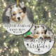 Celebrate your puppy's or pet's first Christmas with this charming and personalised ornament, designed to capture the joy of their very first holiday season. The front features a spot for a photo of your pet with the phrase "My First Christmas" in elegant script calligraphy, along with your pet’s name and birth year for a special, customised touch. On the back, a second photo space is paired with "Merry Christmas" in the same delicate script, with your pet's name and year displayed smaller at the bottom. Paw print accents add an adorable touch, while a soft white ombre effect graces the bottom of each photo, creating a smooth, refined transition. Both the font and paw print colours can be customised to suit your style. This keepsake ornament is perfect for celebrating your furry friend's first holiday, adding warmth and personality to your tree or as a heartfelt gift for fellow pet lovers.