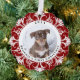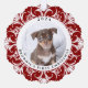 This personalised Christmas ornament features a charming, customisable design with a rich red snowflake background. Perfect for displaying a favourite dog's picture, making it ideal for commemorating their first Christmas. The back showcases a matching snowflake pattern, adding a festive touch to any Christmas tree. The ornament is an elegant keepsake and a thoughtful gift for dog lovers. Happy Ann Designs 2024. The current photo is a placeholder—please replace it with your own photo to make this ornament uniquely yours.