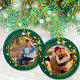 Our First Christmas Together ornament which you can customise with 2 of your favourite photos, your names and the year. The photo template displays your pictures in round format, one on each side of the ornament. Your pictures are framed with an abstract wreath of rings, decorated with gold starts. The design has gold typography on green - other colours are available in my store or, you can click "customise further" to change to the colour of your choice.