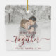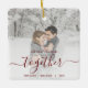 Commemorate your first Christmas as a couple, engaged or married, with this beautiful modern keepsake ornament. The dark red text reads "Our first Christmas together," with the word "together" in elegant handwriting script with flourishes before and after. Replace the sample image with your favorite photo, and add your names and the year. A white gradient filter helps make the text pop.