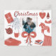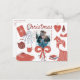 Pretty red and white modern rustic inspired Our First Christmas Together photo postcard featuring a red bow and small traditional seasonal objects: Santa Claus, wood horse, gift, teapot, books, hot chocolate, gingerbread heart on a clear white background. +++++++++ Send your warm wishes to your relatives and friends or use it as a wedding thank you card! +++++++++++ Easy to personalise with your image and text on both sides.
