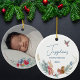 Celebrate your little one's first Christmas with this charming Woodland Animal Baby Photo Ceramic Ornament. The front features delicate watercolor flowers that beautifully frame your baby’s photo. On the back, you'll find an adorable bunny and squirrel, along with customisable text where you can add your baby’s name.