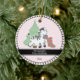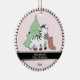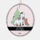Adorable baby zebra with red/green striped, Christmas stocking and green tree in background. Light pink background for a baby girl. Black banner and striped border around ornament. Template created for you. Perfect for new parents celebrating first child at Christmas!