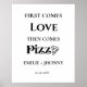 First comes love hen comes pizza. sign for a wedding shower or rehearsal dinner party The modern romantic design incorporates traditional black letters.