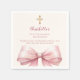 A cream, beige background colour. Decorated with a large pink bow and a golden cross. Personalise and add the name, date and a text.