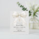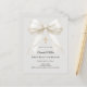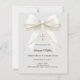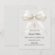 Invite guests with this sophisticated First Holy Communion invitation. The design features a luxurious ivory satin bow draped with delicate pearls and a shimmering gold cross set against a soft dove gray background. It is a beautiful choice for a young girl celebrating her sacred Catholic sacrament.